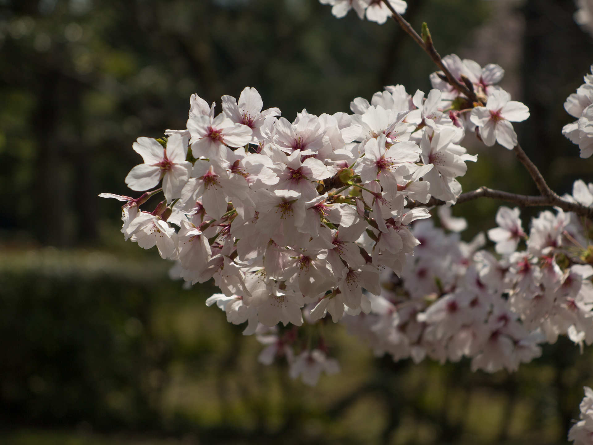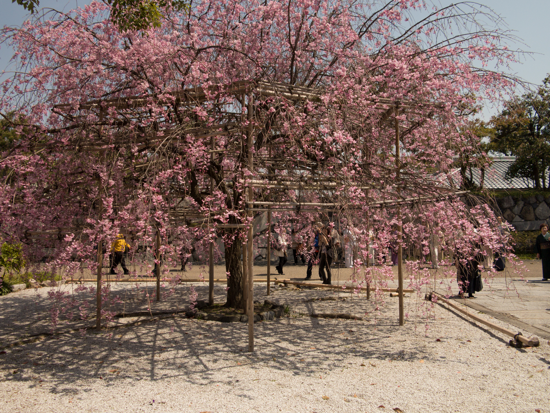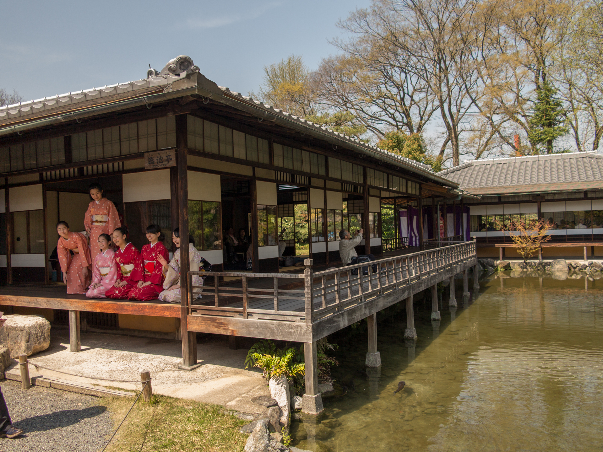 Vårt nästa besök blev den publika trädgården Shosei-en som tillhör Higashi Hinganji templet men ligger ca 400 meter österut, strax nordöst om Kyoto station. Detta är en klassisk promenadträdgård kring en damm med flera fina byggnader. Körsbärsblommorna stod i full blom och parken var full av aktiviteter med många kimonoklädda besökare och värdinnor i tehusen. Trädgården har många mindre delar med flera små tehus med tillhörande trädgård, en takklädd trädbro och mindre paviljonger för att betrakta trädgården. Vid infarten finns en imponerande stenmur ca 3 meter hög bestående av en blandning av gamla och nya stenar i olika former.