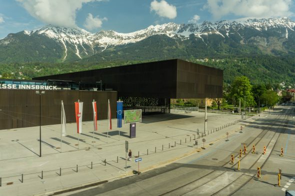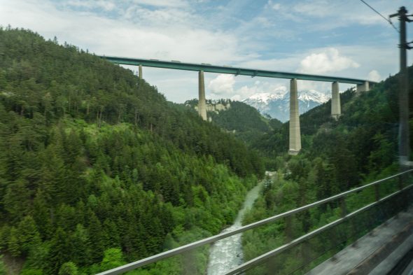Tåget passerar Innsbruck med Alperna i bakgrunden.