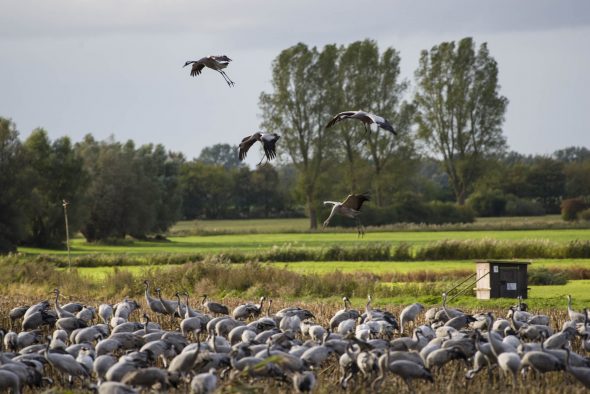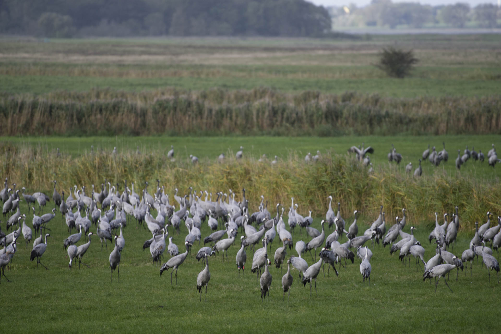 Vid Östersjökusten i norra Tyskland ligger ett flackt landskap med många öar, laguner och strandängar med rikt fågelliv och höga naturvärden. Området är skyddat i nationalparken Vorpommersche Boddenlandschaft och består huvudsakligen av öarna Darss, Zingst, Bock och Ummanz samt västra delen av den stora ön Rügen med innanför liggande laguner och strandängar. Området är bland annat känt för det stora antal tranor som rastar här under våren men främst hösten. Antalet ökar för varje år och har nu nått över 70 000 tranor under oktober månad. Här finns flera naturcenter med information och vid Gross Mohrdorf finns ett trancenter. Några kilometer söderut ligger en observations och matningsplats för tranorna där man kommer nära och kan studera fåglarna. Vid mitt besök den 5:e oktober var det nationalparksdag vid informationscentret på Zingst dit besökarna transporterades i turisttåg från parkeringen i Zingst. Även ön Ummanz besöktes och där fanns övernattningsplatser för tranorna. Annars är det främst i bukten söder om Ostseeheilbad Zingst och på öarna Pramort och Bock som tranorna övernattar för att sedan flyga ut i odlingslandskapet söderut för att äta under dagarna.