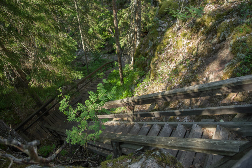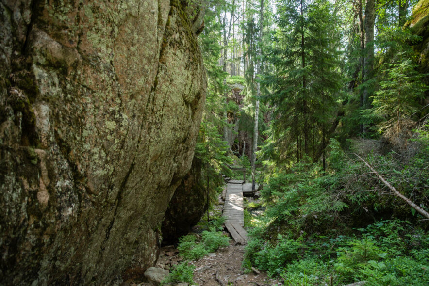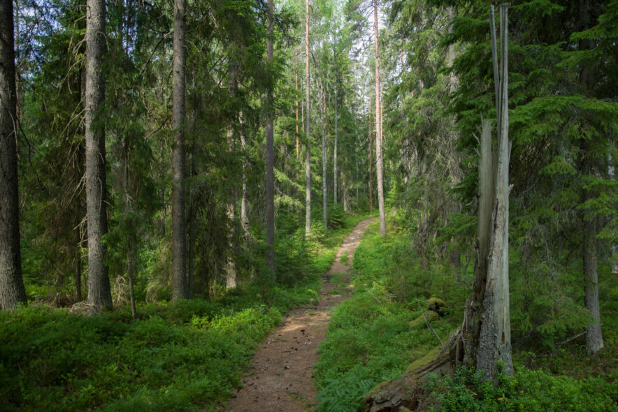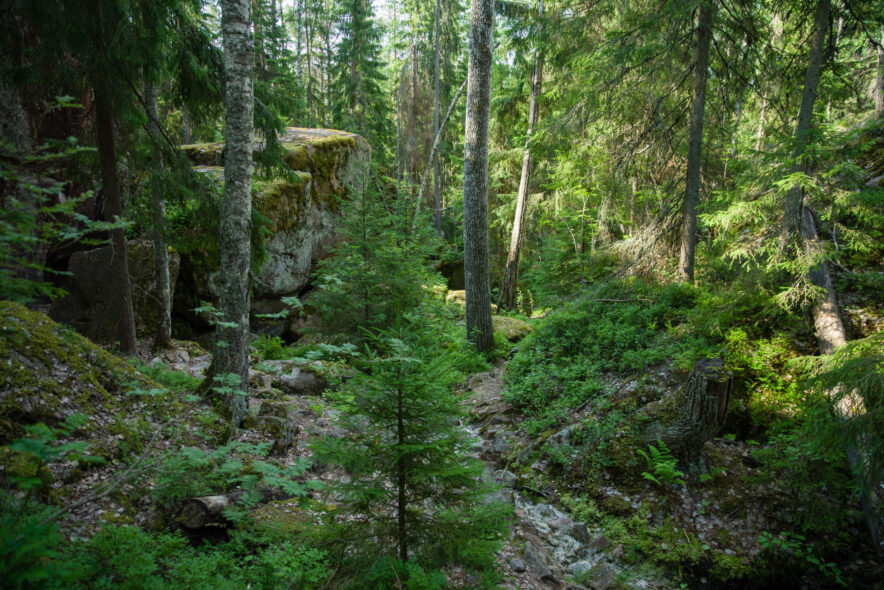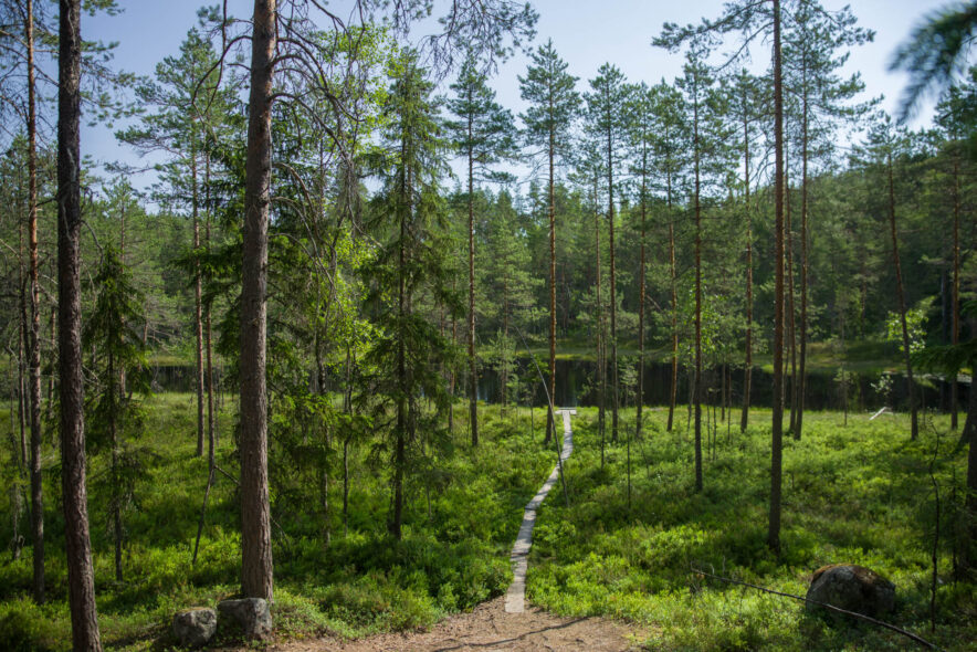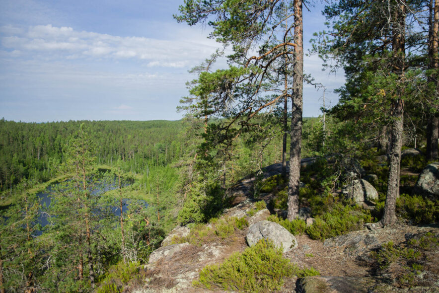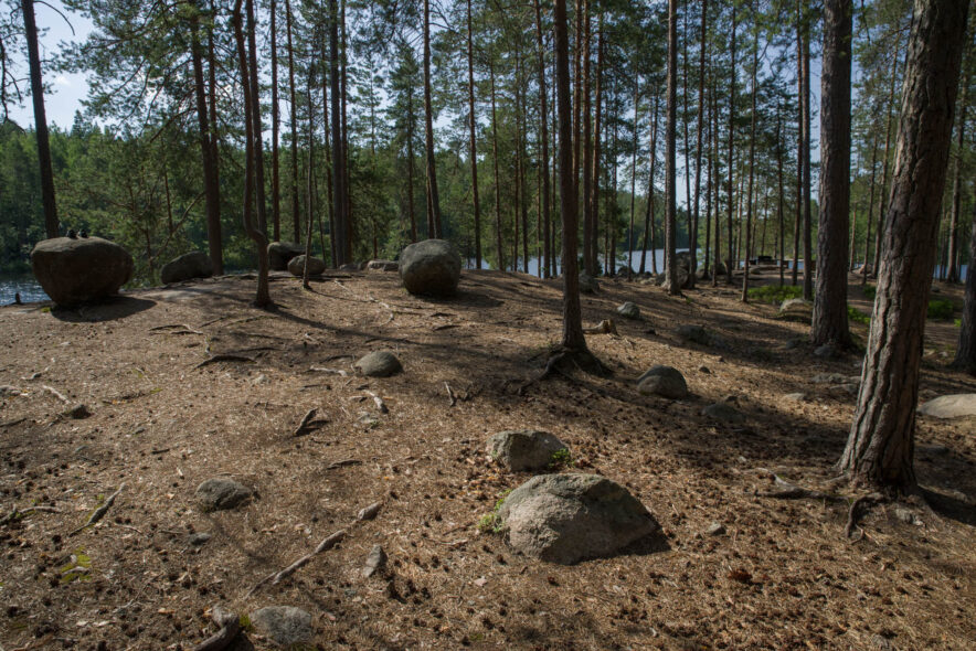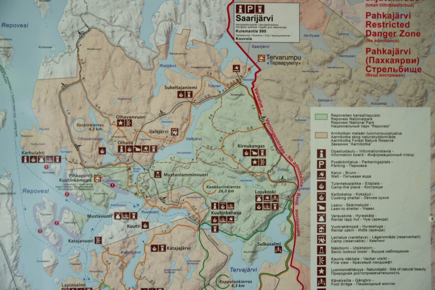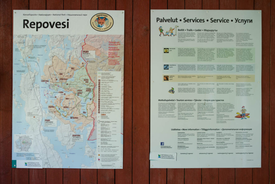 Repovesi nationalpark utgörs av ett kuperat sprickdalslandskap som är skogsklätt med framför allt tallhedskog. I sprickdalarna finns sjöar och myrmarker och mer näringsrika granskogar. Nationalparken gränsar till ett militärt övningsområde i öster med beträdnadsförbud och två rekreationsområden i söder och norr som tillsammans bildar ett stort vildmarksområde. Jag angjorde i nordöst vid Saarijärvi och följde gränsen i öster söderut och sedan vandringsleder över den kuperade terrängen runt sjöarna och tillbaka. Anläggningarna för friluftslivet var som vanligt väl utbyggda med lägerplatser, leder, naturinformation, uthyrning av båtar, terrängcyklingsleder med mera.