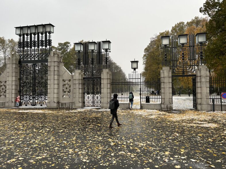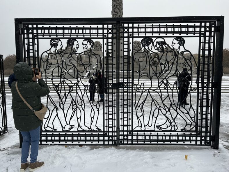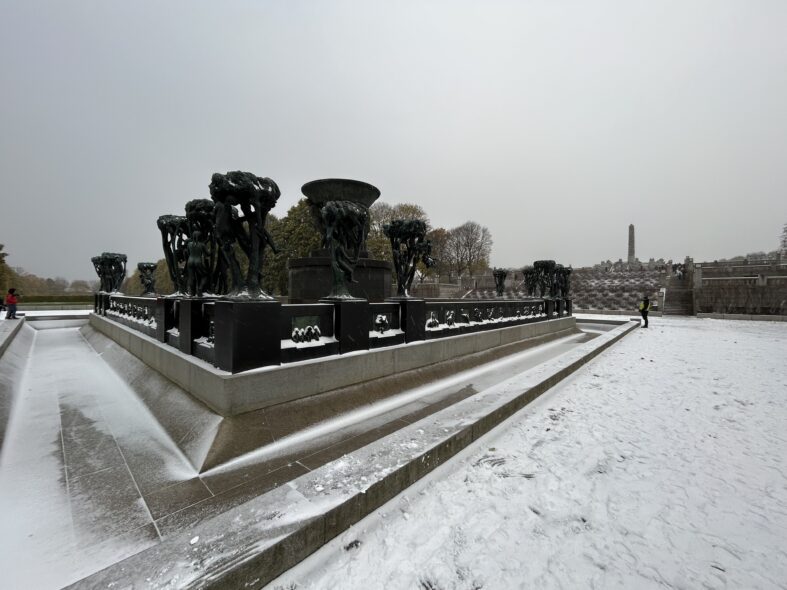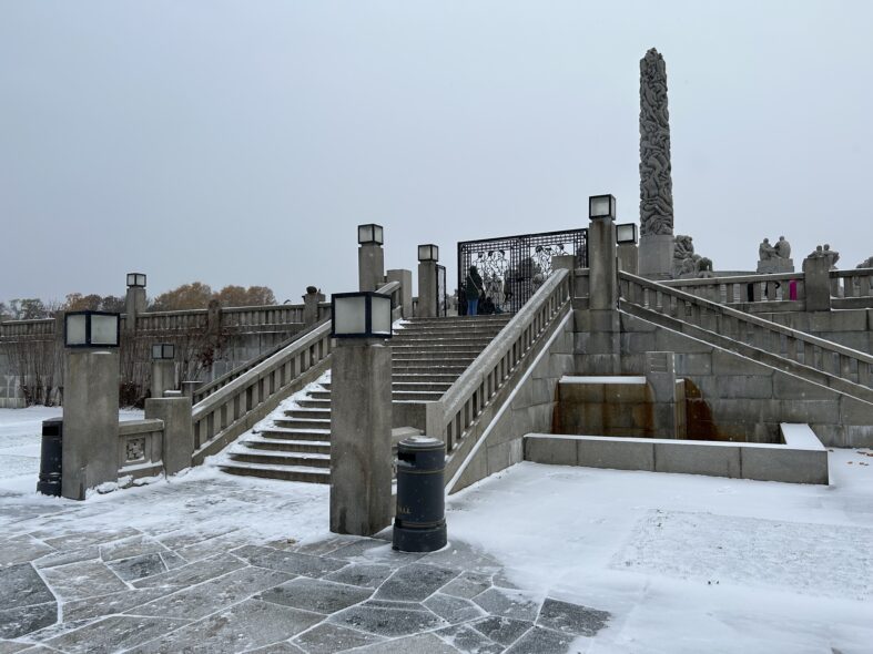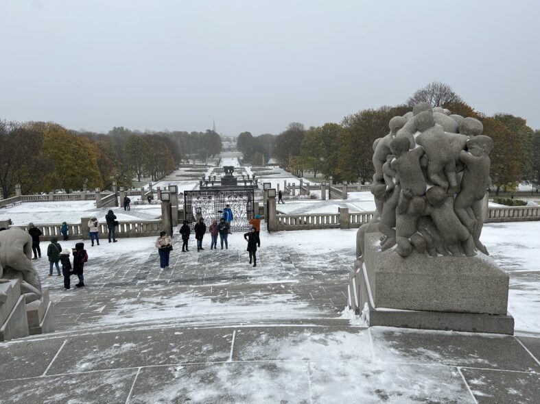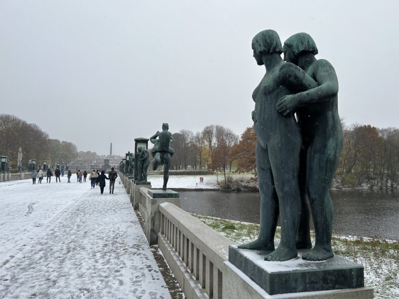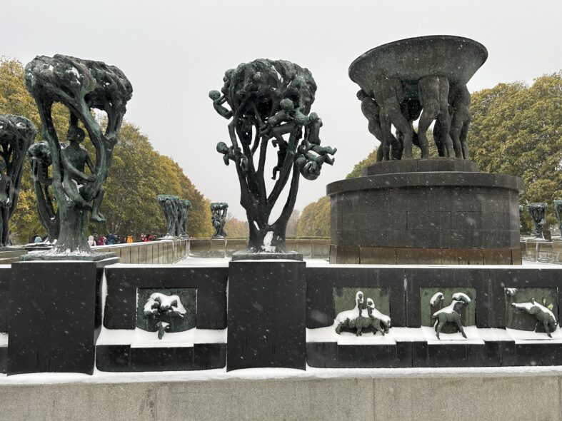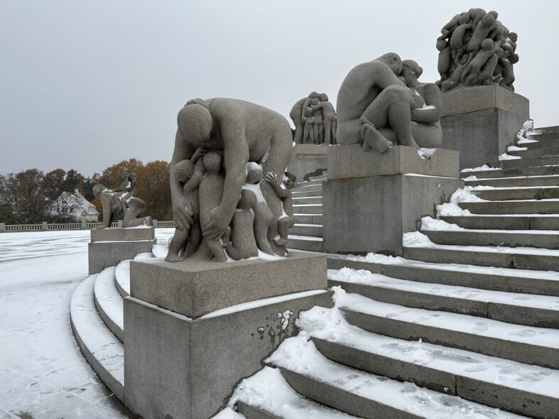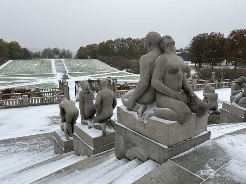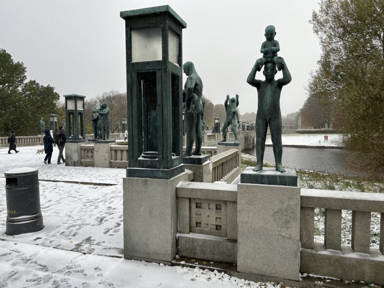 I Frognerparken i nordvästra Oslo finns ett stort antal skulpturer av den kände norske skulpltören Gustav Vigeland. Skulpturparken är 850 meter lång och består av över 200 skulpturer i granit, brons och smidesjärn. Anläggningen påbörjade 1924 men stod inte klar förrän 1950 när Vigeland hade gått bort. Alla skulpturer föreställer människor i olika gestalter och störst är monoliten som är 17 meter hög och föreställer 121 människor. Det tog fyra stenhuggare 14 år att färdigställa skulpturen. Det var en speciell upplevelse att möta alla nakna skulpturer i ihållande snöväder vid mitt besök. Den centrala barockaxeln i parken är monumental och storskalig och inte i min smak som parkrum men detaljerna är omsorgsfullt gjorde och de kvadratiska lamporna ovanligt stilfulla och moderna.