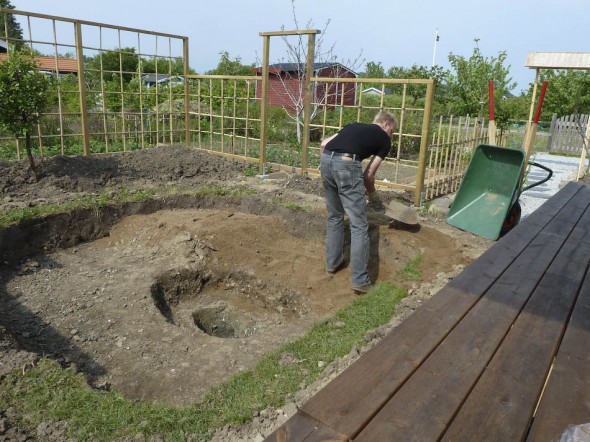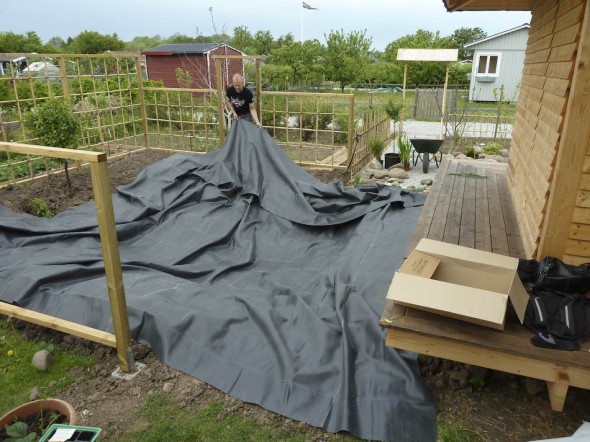 Söndagen den 22 maj sluttfördes arbetet med dammen. 4 skottkärror med sand breddes ut i och kring den grävda gropen, fiberduk breddes ut över sanden och slutligen vecklades den 6×6,1 m stora gummiduken ut. Vatten fylldes på gummiduken, först i det ca 1 m djupa hålet i mitten, sedan det 70 cm djupa partiet runt detta och slutligen upp till 15 cm från kanten. Regnskurar gjorde att arbetet avbröts. (11-13)