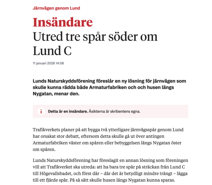 Dagens debattinlägg i Sydsvenskan stod jag och Ingela Björck för med stöd av Tomas Björnsson. Naturskyddsföreningen i Lund föreslår tre spår på det trånga partiet söder om stationen för att inte behöva riva speciellt många hus och samtidigt inte bygga en väldigt klimatpåverkande tunnel under Lund. Då kan norrgående tåg gå på två spår och södergående som släpps iväg från stationen med korta mellanrum kan klara sig på ett spår. Godstågen bör dock ledas utanför Lund.
