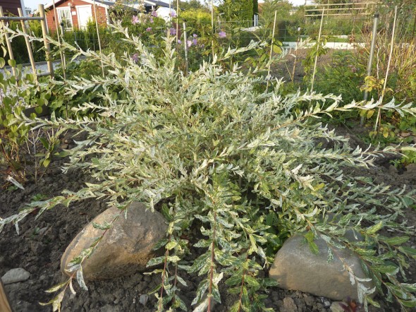 Handlade låsbygel för att låsa väggelementen. Cyklade till kolonin 17.30-19.00 och monterade låsen. Fin kväll ca 19 grader som avtog mot kvällen. På bilden ses japanskt dvärvide som fått fart nu på sensommaren och hösten. Planterades förra hösten (2010).